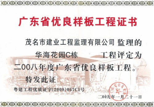 广东和诚工程管理有限公司(原名为“茂名市西鸿土木建筑监理有限公司”、“茂名市建业工程监理有限公司”)监理的“华海花园”工程获二〇〇八年广东省优良样板工程